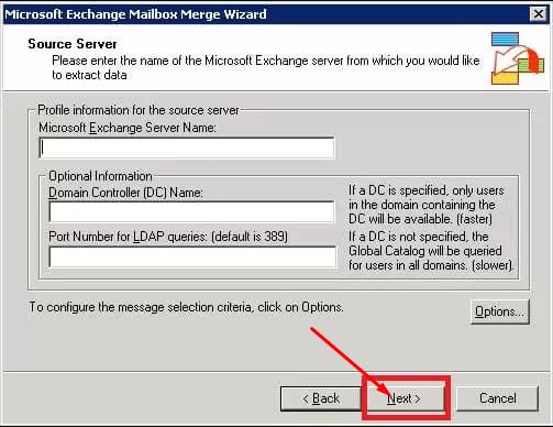 4 – Provide the details for Exchange Server from where you want to convert EDB file and click the Next button. You can also configure the message selection criteria with the Options button.