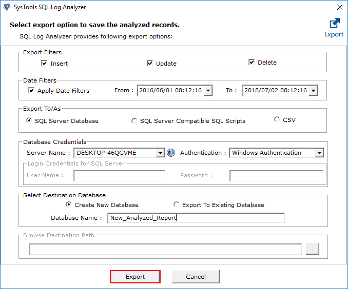 5. Next, you have to fill in the Database Credentials and then select the destination path by choosing to Create New Database or Export to Existing Database.