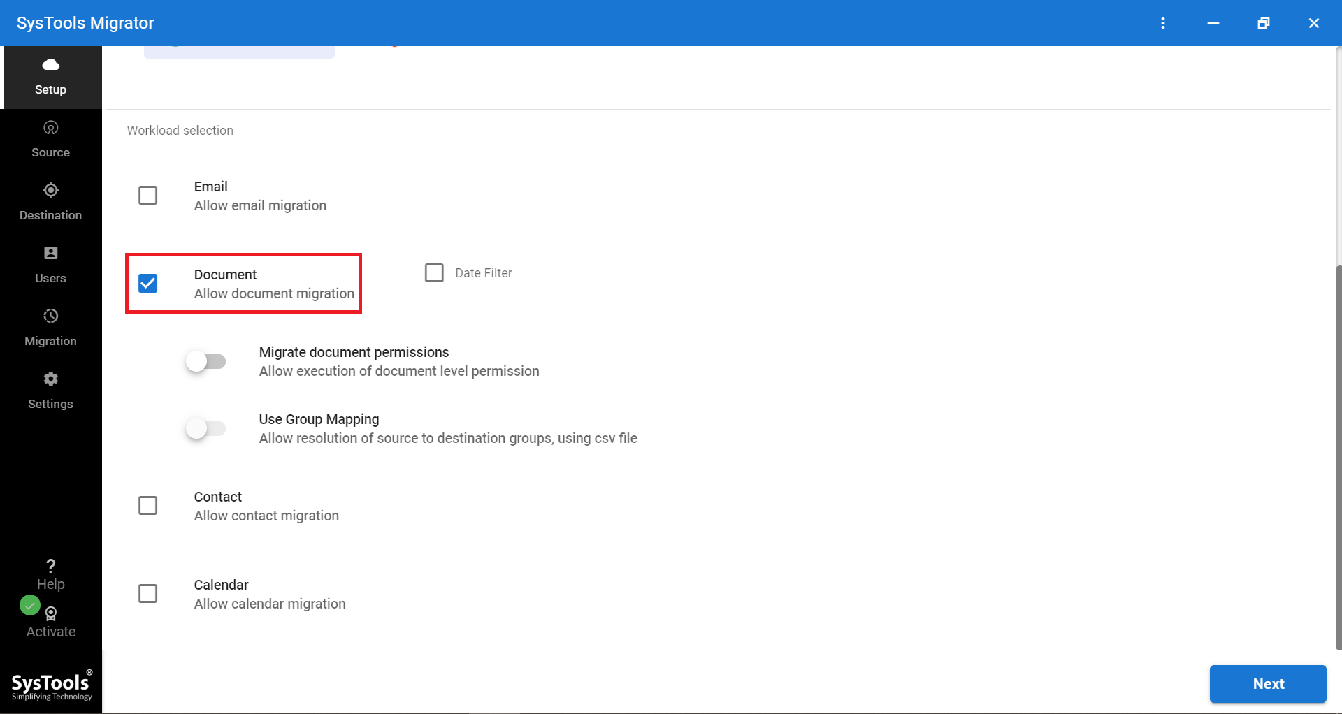 Step 3. Moving further, select the workload category as Documents for the migration.